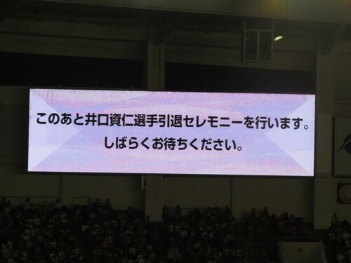 サヨナラ勝ちの興奮冷めやらぬ中、引退セレモニーへ。 ダイエーホークスの「7」 ホワイトソックスの「15」 そしてマリーンズの「6」が並んだ横断幕が登場。 引退セレモニーは井口の足跡をまとめた動画の放映からスタート。 バックスクリーンを見つめる井口。…